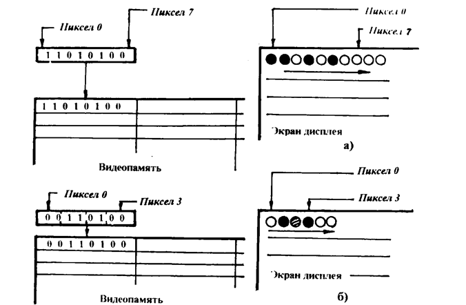 Логическая организация VRAM может быть разная, в зависимости от количества бит на один пиксель. В случае одного или двух бит на пиксель каждая ячейка (байт) соответствует 8 или 4 соседним пикселям строки. При сканировании ячейка считывается в регистр сдвига, из которого информация о соседних точках последовательно поступает на выходные цепи адаптера. Такой способ отображения называется линейным – последовательности пикселей соответствует линейная последовательность бит (или группы бит) видеопамяти (Рис. 11 а, б).