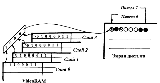 В качестве примера, на Рис. 12 показан вариант, при котором количество бит на пиксель составляет 4 и видеопамять разбита на четыре области (слоя, банка), называемых также цветовыми плоскостями. При этом в каждой плоскости используется линейная организация, где каждый байт содержит по одному биту восьми соседних пикселей. Слои сканируются (считываются в сдвигающие регистры) одновременно. В результате параллельно формируются по 4 бита на каждый пиксель. Такое решение позволяет снизить частоту считывания ячеек памяти – одна операция чтения производится за время прохода лучом восьми пикселей. Ячейки слоёв памяти, отвечающие за одни и те же пиксель, имеют совпадающий адрес. Это позволяет производить параллельную запись информации сразу в несколько цветовых плоскостей (запись для каждого слоя разрешается индивидуально), что также экономит время. Считывание со стороны магистрали конечно возможно только послойное. В режимах 8, 16 и 24 бита на пиксель также используется линейная организация, но каждый байт (слово или три байта) отвечает уже за цвет одного пикселя.