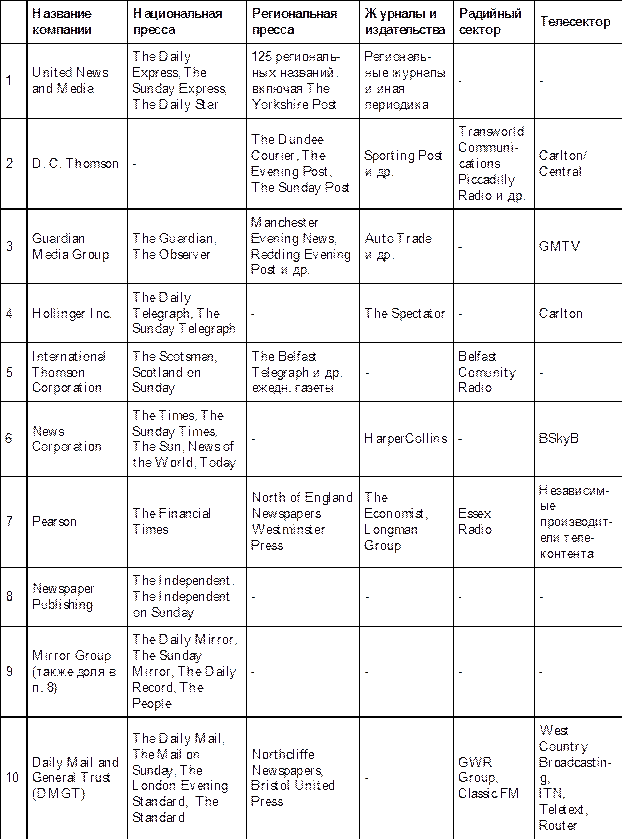 Таблица 1. Кроссмедиальное владение на медиарынке Британии в 1990-е-2000-е годы