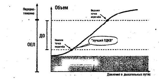Больные ОРДС имеют повышенный риск поражения легких на фоне их перерастяжения. Для избежания этого серьезного осложнения принудительной вентиляции было внесено предложение мониторировать кривые P-V, что позволило бы индивидуально подбирать значения дыхательного объема и ПДКВ. Данный подход поясняет приведенный ниже рисунок. Рисунок 1. Кривая давление-объем имеет нижнюю (небольшой объем) и верхнюю точки (большой объем) перегиба. Нижняя точка может быть использована для титрования уровня ПДКВ, верхняя указывает на достижение дыхательного объема, при котором начинается перерастяжение легких. При высоком дыхательном объеме или ПДКВ и повышении давления в дыхательных путях выше уровня верхней точки происходит уменьшение доставляемого объема и перерастяжение, по, крайней мере, части альвеолярных структур. С целью максимальной защиты легких при ОРДС следует предупреждать их перерастяжение путем установки значения дыхательного объема в области значений, проецирующихся на линейную часть кривой, расположенную между ее перегибами. Концепция защиты легкого при тяжелом ОРДС предусматривает использование небольших дыхательных объемов (5-8 мл/кг массы тела), что позволяет поддерживать пиковое давление в дыхательных путях ниже уровня верхней точки перегиба P-V кривой и установку уровня ПДКВ выше нижней точки, что предупреждает раннее экспираторное закрытие дыхательных путей и спадение альвеол. Подобный подход к ИВЛ нередко приводит к повышению уровня РаСO2 и снижению рН: пределы толерантности к данным изменениям получили название «допустимой гиперкапнии» ДГК - РНС, англ.) [12]. В то время, как острая гиперкапния потенциально приводит к внутриклеточному ацидозу, легочной гипертензии, повышению мозгового кровотока и активации симпатоадреналовой системы, постепенное повышение РаСO2 создает условия для компенсации этих нарушений. У больных с тяжелым ОРДС даже весьма значимая гиперкапния при условии постепенного развития в течение нескольких дней хорошо переносится [12]. Использование контролируемой по давлению вентиляции в сочетании с ДГК может снижать летальность при тяжелом ОРДС. При ретроспективном анализе 50 случаев тяжелого ОРДС госпитальная летальность оказалась значимо ниже, чем можно было ожидать на основе прогностического расчета по шкале АРАСНЕ-Н (16% и 39,6%, соответственно) [12]. Эти результаты были подтверждены в проспективном исследовании, включавшем 53 больных [13]. Недавно Amato и сотр. на основе рандомизированного и контролируемого исследования показали, что при использовании концепции ДГК отмечается улучшение оксигена-ции, требуются более низкие уровни давления в дыхательных путях и достигается снижение летальности [14]. • Действие ДГК на физиологические процессы организма весьма многогранно, при этом ряд аспектов данного влияния изучен очень плохо. В частности, у пациентов с черепно-мозговыми травмами, гипоксическим повреждением мозга или кардиопатией следует тщательно взвесить возможные преимущества и недостатки от использования данного метода.