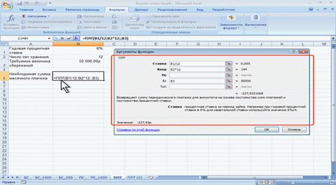 В зависимости от порядка расчетов могут быть различные функции. В простейших случаях для расчета можно использовать функцию ПЛТ. Функция ПЛТ вычисляет размер периодических выплат, необходимых для погашения займа, полученного под определенный процент, за определенный срок. Эту же функцию можно использовать для вычисления величины регулярных вложений под определенный процент, необходимых для достижения определенной величины вклада за определенный срок. Синтаксис функции ПЛТ(А;В;С;D;Е), где A – процентная ставка за период; В– общее число платежей; C – выплата, производимая в каждый период и не меняющаяся за все время выплаты; D – требуемое значение будущей стоимости или остатка средств после последней выплаты. Если аргумент опущен, он полагается равным 0 (будущая стоимость займа, например, равна 0); E – число 0 или 1, обозначающее, когда должна производиться выплата. 0 или опущен – в конце периода. 1 – в начале периода. При создании формулы следует устанавливать одинаковую размерность периода для процентной ставки и числа платежей. Например, если выплаты производятся один раз в год, то и процентная ставка должна быть дана в годовом исчислении, а если выплаты производятся ежемесячно, то должна быть задана месячная процентная ставка. При создании формулы не обязательно указывать все аргументы функции. Вместо отсутствующего аргумента в строке формул должна быть точка с запятой. Например, необходимо рассчитать величину ежемесячного вложения под 6 % годовых, которое через 12 лет составит сумму вклада 50000 руб. (рис. 8.12).