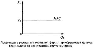 Чтобы определить спрос на любой ресурс, необходимо выявить функциональную зависимость между количеством ресурса (QR), на которое предъявляется спрос, и ценой этого ресурса (РR) при прочих равных условиях, т. е. при неизменности других факторов, оказывающих воздействие на спрос на ресурсы (DR). Устанавливая, как функционально связаны цена ресурса (PR) и величина спроса на ресурс (QR), предъявляемого со стороны отдельного производителя, можно определить особенности индивидуального спроса на ресурс — спроса со стороны одного покупателя, в качестве которого на факторном рынке выступает индивидуальный товаропроизводитель. Известное условие MRP = MRC дает возможность установить соответствие между РR и QR. Для проведения дальнейшего анализа условимся, что привлекающая ресурс фирма приобретает его на факторном рынке совершенной конкуренции, а значит, не в состоянии повлиять на рыночную цену данного ресурса. Признаки совершенно конкурентного рынка ресурсов: 1. Множество покупателей конкурируют между собой в приобретении ресурсов заданного качества, которые поставляются в продажу соперничающими между собой продавцами. 2. Отдельный наниматель потребляет только небольшую часть от имеющегося объема предложения каждого конкретного ресурса. 3. Отдельный поставщик любого экономического ресурса формирует только малую часть общего объема предложения и не может ощутимо влиять на рыночное предложение и на цену. 4. Продавцы экономических ресурсов могут свободно войти на любой рынок и так же свободно уйти с любого рынка, т. е. имеют возможность перемещать свои ресурсы из одной сферы приложения в другую. Если фирма-наниматель экономического ресурса не имеет возможности повлиять на цену приобретаемого ею фактора производства, то любое количество данного фактора она может приобрести только по той цене, которую устанавливает рынок, и тогда ее предельные издержки для каждой единицы ресурса (MRC) будут равны цене этого ресурса PR. Предложение ресурса (SR) для конкретной фирмы будет являться абсолютно эластичным, и его график совпадет с линией МRС.