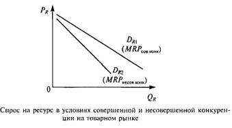 Поскольку, как было выяснено выше, MRC = PR, то условие максимизации прибыли MRP = MRC будет иметь вид MRP = PR. Если PR = P1, то предъявлять спрос на ресурс R (изменяя объемы его использования, а следовательно, изменяя значения показателя предельного продукта в денежном выражении — MRP) фирма будет до тех пор, пока не будет выполняться условие Р1 = MRP Пусть это условие достигается при объеме применения этого ресурса равном QR1. Если цена ресурса измените я и составит РR = Р2 то фирма будет вынуждена сократить или увеличить количество применяемого ресурса до QR2, чтобы выполнялось тождество Р2 = MRP2. Новое изменение PR, допустим до PR = Р3, потребует от фирмы аналогичных действий, направленных на достижение условия Р3 = MRP3. Очевидно, что это равенство будет выполняться при привлечении некоторого другою объема данного ресурса, например QR3. Подобный алгоритм рассуждений позволит нам найти функциональную зависимость между ценой ресурса (PR) и величиной спроса на него со стороны отдельной фирмы (QR), а значит, построить модель спроса на ресурс (R), графическая интерпретация которой даст нам кривую спроса на ресурс (DR). На текущем этапе анализа есть основания сделать вывод о том, что кривой спроса фирмы на ресурс будет являться кривая предельного продукта в денежном выражении. Кривая спроса на ресурс со стороны фирмы показывает, как изменяется объем необходимого фирме ресурса при изменении цен на него. Существует обратная зависимость между ценой ресурса и количеством этого ресурса, на которое фирма предъявляет спрос. Если фирма, использующая в производстве ресурс R, реализует свою продукцию на рынке совершенной конкуренции, то расположение графика DR (MRPсов..конк.) на плоскости будет завит сеть от предельной производительности данного ресурса, т.е. от динамики показателя МР, и от цены производимой продукции PX. Поясним: значение предельного продукта в денежном выражении рассчитывались по формуле mrp = mr х MP, причем для реализующей свой продукт на конкурентном рынке фирмы MR = РX, следовательно, MRP = Рх x MP. В условиях чистой конкуренции Рх = const. По этой причине значения показателя MRP (MRP = Рх x MP) будут находиться в прямой зависимости только от величии MP. Поведение же последнего, как было выяснено в главе, посвященной издержкам производства, подчинено действию закона убывающей предельной отдачи. Только из-за закона убывающей отдачи кривая DR (кривая спроса на ресурс конкурентной фирмы) будет плавно понижаться по мере увеличения объемов QR. Предположим теперь, что изменились условия функционирования рассматриваемой фирмы, и она продает свою продукцию на рынке несовершенной конкуренции. В предыдущей теме мы выяснили, что спрос на продукцию такой фирмы будет представлен нисходящей кривой, причем значения предельного дохода MR (от реализации каждой последующей единицы продукции) не будет совпадать с ценой товара (MR не равно Рх), график MR тоже будет иметь падающий характер, т. е. MR не равно const. Следовательно, при определении условия максимизации прибыли неконкурентным продавцом необходимо исходить из тождества РR = MRP = MR x MP. Это означает, что при любой цене ресурса PR на величину предельного продукта в денежном выражении (MRP) будет оказывать воздействие два фактора — динамика предельного продукта данного ресурса (MP) и изменение предельного дохода фирмы (MR). Если цена ресурса РR=P1, то фи