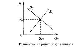 Кривая спроса на услуги капитала будет иметь нисходящий характер, отражая зависимость между предельной доходностью услуг капитала и объемом капитала. Фирме будут требоваться капитальные услуги до тех пор, пока предельная доходность услуг капитала будет равна их цене — рентной оценке (R). В долгосрочном периоде кривые спроса и предложения услуг капитала будут иметь, соответственно, нисходящий и восходящий вид. Кривая спроса на капитал Dc демонстрирует спрос на капитальные услуги при различной величине рентной оценки. Объемы предложения капитальных услуг показаны кривой Sc. Равновесной рентной оценке R0 соответствует равновесный объем капитальных услуг Qco.