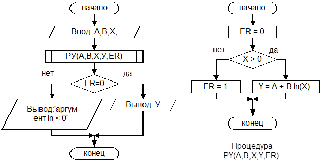 где ln(x) – натуральный логарифм. Так как при Х <=0 значение логарифма не определено, то надо предусмотреть проверку Х и при Х<=0 программа должна выдавать сообщение "аргумент логарифма < 0". Схемы алгоритмов главной программы и процедуры вычисления функции приведены на рис.3.7.7.