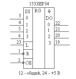 Примером параллельного регистра может быть 1533ИР34 – четырехразрядный регистр с тремя состояниями на выходе, со входом обнуления низким уровнем сигнала R и с занесением информации высоким уровнем сигнал L.