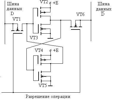 Шины данных обеспечивают как передачу прямого и инверсного одноразрядных кодов с выводов ИС через усилитель записи к элементу памяти, так и обратную передачу от элемента памяти на выход ИС через усилитель считывания. Транзисторы VT1, VT2 работают как двунаправленные. Открываются эти транзисторы высоким уровнем сигнала «Разрешение операции», формируемым дешифратором управления выбора элементов в зависимости от адреса и сигнала разрешения выбора ИС. Несколько сложнее базовый элемент памяти для ИС ОЗУ ТТЛ, что вызвано необходимостью разделения шин передачи и приема данных. Количество параллельно записываемых и считываемых разрядов в статических ИС RAM может быть 1, 4, 8, емкость – от 64 бит для 155РУ2 (16х4) до 16 К бит – для 537РУ10 (2Кх8). ИС с небольшой разрядностью слова имеют, как правило, разделенные входы и выходы, ИС с большой разрядностью – с совмещенными входами и выходами. Статические ИС ЗУ имеются как в общих сериях логических элементов (155, 531, 561), так и в специализированных сериях 541 (ТТЛШ), 537 (КМОП)