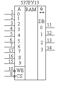 Пример ЗУПВ КМОП 537РУ13, емкостью 1Кх4 с совмещенными входами/выходами; направление передачи данных определяется сигналом WE (разрешение записи). Если WE=0 и CS=0 (разрешение выбора ИС) – выполняется операция записи и данные поступают с выводов ИС к внутренним ее элементам памяти. При WE=1 и CS=0 осуществляется считывание информации с внутренних ячеек памяти и передачу их на выходы ИС. Если CS=1, выходы ИС находятся в состоянии высокого импеданса.
