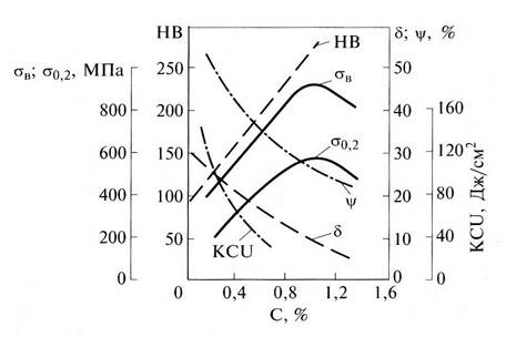 Сплавы железа с углеродом, содержащие до 2,14% С и малое количество других элементов (примеси), называются углеродистыми сталями. Углеродистые стали выплавляются в электропечах, мартеновских печах и кислородных конвертерах. Считается, что наиболее высокими свойствами обладают стали более чистые по содержанию вредных примесей серы и фосфора, а также газов и неметаллических включений. Такие стали используются для изготовления наиболее ответственных деталей. Влияние углерода и примесей на свойства стали Углерод оказывает значительное влияние на свойства стали. Даже при малом изменении содержания углерода в стали, изменяются механические свойства. Увеличение содержания углерода в стали приводит к повышениюпрочности, твердости и понижению пластичности. Кроме того, увеличение содержания углерода повышает порог хладноломкости и уменьшает ударную вязкость. Зависимость механических свойств стали от содержания углерода приведена на рис.8.1.
