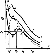 Для выявления физического смысла полученных выводов рассмотрим в системе координат р – J изотермы, построенные по уравнению Ван – дер – Ваальса (рис. 6.5). Первый случай имеет место при высоких температурах, когда изотермы имеют вид кривых гиперболического характера (например, линия 1-2). В этом случае каждому давлению соответствует вполне определенный удельный объем (например, давлению ра соответствует удельный объем Jа). Это значение удельного объема м является действительным корнем уравнения Ван – дер – Ваальса, оба же мнимых корня в этом случае физического смысла не имеют и должны быть отброшены. Тело в этом случае при любых давлениях находится в газообразном состоянии. Второй случай имеет место при сравнительно низких температурах, когда изотермы имеют два перегиба (например, линя 3-4). В этом случае между точками e и f находится область, в которой каждому давлению соответствует три значения удельного объема (например, давлению ра соответствуют удельные объемы Jb, Jс и Jd),которые и являются тремя действительными и различными корнями уравнения Ван – дер – Ваальса. Участок 3-b соответствует изотермическому сжатию тела, находящегося в газообразном состоянии, причем в точке b оно уже начинает переходить в жидкое состояние. Точка d соответствует такому состоянию тела, когда оно уже полностью превратилось в жидкость, в соответствии с чем участок d – 4 представляет собой изотермическое сжатие жидкости. Точка с соответствует промежуточному двухфазному состоянию тела. Участок кривой b – f соответствует неустойчивому состоянию переохлажденного пара, а участок d– e – также неустойчивому состоянию перегретой жидкости. Что касается участка e–f, то он вообще физического смысла не имеет, поскольку в действительности при изотермическом сжатии тело переходит из газообразного в жидкое состояния при постоянном давлении, т.е. по горизонтальной линии b–d. Третий случай имеет место при вполне определенной для каждого тела температуре, когда точки b и d, сближаясь с повышением температуры, сливаются в одну точку k, в которой имеет место перегиб соответствующей изотермы, причем касательная к ней в этой точке имеет горизонтальное направление. Точка k называется критической точкой, а соответствующие ей параметры ркр, Jкр и Ткр называются критическими параметрами. Критическая температура, существование которой было открыто в 1861 г Д.И. Менделеевым, характеризуется тем, что при температурах выше нее невозможно путем изотермического сжатия добиться перехода газа в жидкое состояние. Аналитически условия критического состояния тела выражаются уравнениями