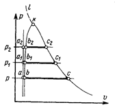 где р выражено в барах, а Линия b – b1– b2…, отделяющая область жидкости от области влажного пара и характеризуемая равенством х = 0, называется нижней пограничной кривой; линия c – c1 – c2..., отделяющая область влажного пара от области пара перегретого и характеризуемая равенством х=1, называется верхней пограничной кривой. С ростом давления разность Как видно из графика, точка k соответствует некоторому предельному состоянию вещества, при котором исчезает видимое различие между жидкостью и паром. Критические параметры, характеризующие это состояние для каждого вещества, имеют определенные значения. Так, например, для воды ркр=221,15 бар, ркр=374,12°С, ркр= 0,003147 м3/кг. При сверхкритических давлениях условной границей между жидкостью и перегретым паром служит линия k-l, соответствующая пиковым значениям теплоемкости ср.