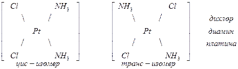 которая возможна для комплексов имеющих 2, 4, 6 и т.д. к.ч. При расположении одинаковых лигандов по одну сторону получается цис – изомер, по разные транс – изомер. II Оптическая (или зеркальная) изомерия возможна для асимметричных комплексов, которые не имеют ни одной плоскости симметрии, делящей молекулу на две одинаковые (симметричные) части. Они (комплексы) способны вращать плоскость поляризации света: один влево (l – изомер), другой вправо (d – изомер). III Сольватная изомерия: возникает при изменении распределения молекул растворителя между внутренней и внешней сферами комплекса. Для водных растворов этот ид изомерии называется гидратным. При нагревании водного раствора