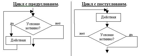 Цель: формирование знаний о форматах операторов While, Repeat, навыков применения операторов, приемов составления схем алгоритмов циклических вычислительных процессов с пред- и постусловием. Примеры использования операторов.