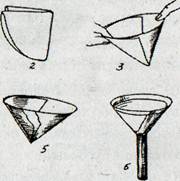 Рис. 3 Для этого круглый фильтр складывают пополам по диаметру, затем снова пополам и вкладывают в сухую воронку (рис. 4).