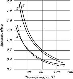 Рис. 4.2. Зависимости вязкости различного типа вод от температуры по В.И.Сергеевич и Т. П. Жузе: 1 – вода Каспийского моря при 29,4 МПа; 2,3 – хлоркальциевый тип воды Туймазинского месторождения при 19,6 МПа и 29,4 МПа; 4 – чистая вода при 29,4 МПа