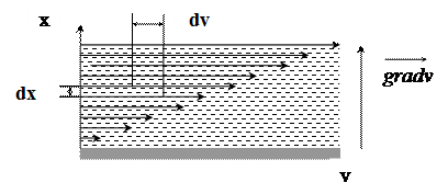 Рис. 5 Слой, “прилипший” ко дну неподвижен. По мере удаления от дна скорость жидкости увеличивается. Максимальная скорость жидкости будет у слоя, который граничит с воздухом. Сила внутреннего трения пропорциональна площади взаимодействующих слоев S и тем больше, чем больше их относительная скорость. Так как разделение на слои условно, то принято выражать силу в зависимости от изменения скорости, приходящегося на единицу длины в направлении, перпендикулярном скорости, то есть от величины