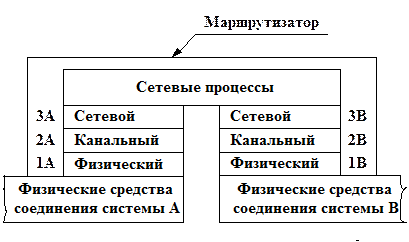 Маршрутизатор (router) – ретрансляционная система, соединяющая две коммуникационные сети либо их части. Каждый маршрутизатор реализует протоколы физического (1А, 1B), канального (2А, 2B) и сетевого (3A, 3B) уровней, как показано на рис.9.9. Специальные сетевые процессы соединяют части коммутатора в единое целое. Физический, канальный и сетевой протоколы в разных сетях различны. Поэтому соединение пар коммуникационных сетей осуществляется через маршрутизаторы, которые осуществляют необходимое преобразование указанных протоколов. Сетевые процессы выполняют взаимодействие соединяемых сетей. Маршрутизатор работает с несколькими каналами, направляя в какой-нибудь из них очередной блок данных. Маршрутизаторы обмениваются информацией об изменениях структуры сетей, трафике и их состоянии. Благодаря этому, выбирается оптимальный маршрут следования блока данных в разных сетях от абонентской системы-отправителя к системе-получателю. Маршрутизаторы обеспечивают также соединение административно независимых коммуникационных сетей.