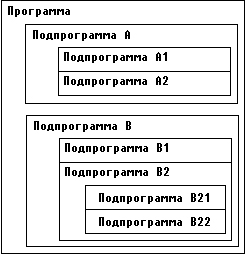 Подпрограмма любого уровня имеет обычно множество имен констант, переменных, типов и вложенных в нее подпрограмм низшего уровня. Считается, что все имена, описанные внутри подпрограммы, как бы «невидимы» снаружи подпрограммы. Например, в рассмотренном выше примере из основной программы можно обратиться к процедурам А и В, но нельзя вызвать ни одну из вложенных в них процедур А1, А2, В1 и т.д. Сказанное относится не только к именам подпрограмм, но и вообще к любым именам, объявленным в них - типам, константам, переменным и меткам. Все имена в пределах подпрограммы, в которой они объявлены, должны быть уникальными и не могут совпадать с именем самой подпрограммы. При входе в подпрограмму низшего уровня становятся доступными не только объявленные в ней имена, но и сохраняется доступ ко всем именам верхнего уровня. Так, например, из подпрограммы В21 мы можем вызвать подпрограмму А, использовать имена, объявленные в основной программе, в подпрограммах В и В2, и даже обратиться к ним. Любая подпрограмма может, наконец, вызвать саму себя - такой способ вызова называется рекурсией. Пусть имеем такое описание: Program..; var V1:...; Procedure A; var V2:...; ....... end {A}; Procedure B; var V3:...; Procedure Bl; var V4:...; Procedure В11; var V5; ....... Из процедуры В11 доступны все пять переменных V1,..., V5, из процедуры В1 доступны переменные V1,..., V4, из центральной программы - только V1. При взаимодействии подпрограмм одного уровня иерархии вступает в силу основное правило Турбо Паскаля: любая подпрограмма перед ее использованием должна быть описана. Поэтому из подпрограммы В можно вызвать подпрограмму А, но из А вызвать В невозможно (точнее, такая возможность появляется только с использованием опережающего описания). Подпрограмме доступны только те объекты верхнего уровня, которые описаны до описания данной подпрограммы. Эти объекты называются глобальными по отношению к подпрограмме. В отличие от стандартного Паскаля в Турбо Паскале допускается произвольная последовательность описания констант, переменных, типов, меток и подпрограмм. Например, раздел VAR описания переменных может появляться в пределах раздела описаний одной и той же подпрограммы много раз и перемежаться с объявлениями других объектов и подпрограмм. Для Турбо Паскаля совершенно безразличен порядок следования и количество разделов VAR, CONST, TYPE, LABEL, но при определении о6ласти действия этих описаний следует помнить, что имена, описанные ниже по тексту программы, недоступны из ранее описанных подпрограмм, например: var V1:...; Procedure S; var V2:...; end {S}; var V3:...; ....... Из процедуры S можно обратиться к переменным V1 и V2, но нельзя использовать V3, так как описание V3 следует в программе за описанием процедуры S. Имена, локализованные в подпрограмме, могут совпадать с ранее объявленными глобальными именами. В этом случае считается, что локальное имя «закрывает» глобальное и делает его недоступным, например: var i: Integer; Procedure P; var i: Integer; begin writeln(i) end { P }; begin i:= 1; P; end. Что напечатает эта программа? Все, что угодно: значение внутренней переменной I при входе в процедуру Р не определено, хотя одноименная глобальная переменная имеет значение 1. Локальная переменная «закроет» глобальную и на экран будет выведено произвольное значение, содержащееся в неинициированной внутренней переменной. Если убрать описание var i: Integer; из процедуры Р, то на экран будет выведено значение глобал