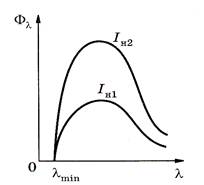 где h - постоянная Планка; ν - частота рентгеновского кванта; е — заряд электрона; U - ускоряющее напряжение. Для максимальной частоты излученного рентгеновского кванта получим: ν max = eU/ h. (2) Это соответствует случаю, когда энергия тормозящегося электрона (eU) полностью переходит в энергию рентгеновского кванта (hνmax). Обладая максимально возможной частотой, квант будет характеризоваться минимальной длиной волны: λmin = c/ ν max = hc/ eU, (3) где с - скорость света. Очевидно, что величиной λmin можно управлять, увеличивая или уменьшая ускоряющее напряжение U: чем оно больше, тем меньше и тем жестче будет возникающее рентгеновское излучение. Площадь под спектральной кривой при некотором фиксированном напряжении выражает полный поток Ф (или мощность) возникающего рентгеновского излучения. Он равен: Ф = k I U² Z, (4)