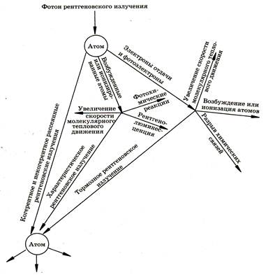 где hν´ — энергия этого вторичного фотона. На рис.5 приведена схема возможных процессов, возникающих при попадании РИ в вещество.