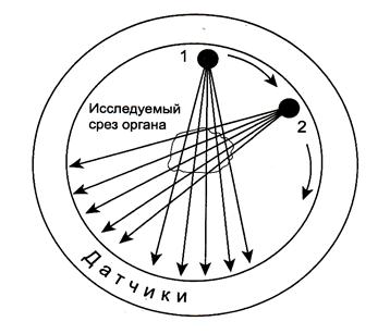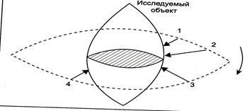 Во-вторых, авторы предложили получать изображение в срезах, просвечивая объект с разных сторон (рис.7), источник излучения вращается, его последовательные положения обозначены цифрами 1, 2, 3, 4.