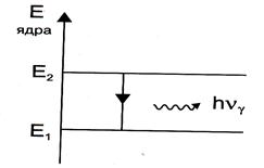 ( На первый взгляд кажется, что, помимо нейтронов и протонов ядра элементов должны содержать также позитроны и электроны, поскольку многие ядра (ядра радиоактивных изотопов) испускают эти частицы. Однако детальный анализ различных свойств ядер заставляет признать, что в них отсутствуют как позитроны, так и электроны. Однако если позитроны и электроны в «готовом» виде в ядре не присутствуют, то, очевидно, в процессе распада ядра, сопровождающегося вылетом одной из этих частиц, они образуются заново в результате превращений внутри ядра. При этом при вылете позитрона (положительного заряда) один из протонов превращается в нейтрон, а при вылете электрона (отрицательного заряда), наоборот, один из нейтронов превращается в протон. Допущение об образовании электронов и позитронов при радиоактивном распаде тем более естественно, что образование этих частиц наблюдается и в других процессах. Наконец, обсудим γ-излучение, при испускании которого ядро некоторого элемента переходит из возбужденного в невозбужденное состояние (рис. 9). Излучающийся при этом квант электромагнитного излучения высокой частоты и малой длины волны называется γ-квантом.