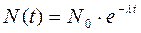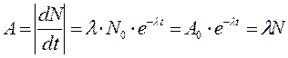 где N(t) — число нераспавшихся к моменту времени t ядер; N0 — начальное число нераспавшихся ядер; λ — постоянная распада. Скорость изменения числа нераспавшихся ядер, взятая по абсолютной величине, называется активностью радиоактивного препарата. Находя производную числа нераспавшихся ядер по времени, получим для зависимости активности от времени выражение: