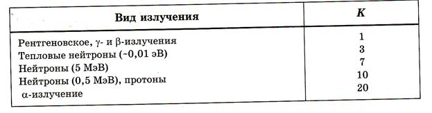 где к - коэффициент качества, определяемый типом радиоактивного излучения, для γ-излучения и рентгеновского излучения он равен единице, для потока нейтронов варьирует в пределах от 3 до 5 в зависимости от их энергии, для потока α -частиц — около 20 (рис.10). Системной единицей измерения биологической дозы является зиверт, внесистемной - биологический эквивалент рада (бэр). 1 бэр = 0,01 Зв.
