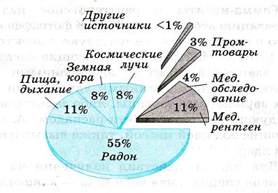 Важна не только доза облучения, но и время, в течение которого объект подвергается облучению. Поэтому вводится понятие мощности дозы. Это отношение дозы ко времени облучения. В заключение приведем некоторые конкретные количественные характеристики: безопасная мощность дозы (так называемый радиоактивныйфон) составляет примерно 12—14 мкР/ч (микрорентген в час), при дозе 30—50 мкР/ч после достаточно длительного облучения организм начинает болезненно реагировать. Однократная доза около 500 Р смертельна. В любом месте на поверхности Земли, под землей, в водоемах, в атмосфере и в космическом пространстве существует ионизирующее излучение, или естественный радиационный фон. Среднее значение эквивалентной дозы поглощенного излучения, обусловленной радиационным фоном, составляет около 2 мЗв в год. Наиболее значительный вклад в естественный радиационный фон вносит радиоактивный радон и продукты его распада, попадающие в организм человека при дыхании. Образуясь в почве, инертный газ выходит в атмосферу. Его концентрация особенно велика в закрытых непроветриваемых помещениях. Процентный вклад различных источников ионизирующего излучения в естественный радиационный фон приведен на рис.11. Гамма-излучение естественных радиоактивных изотопов земной коры (урана, тория, калия) составляет около 8% естественного фона. Такой же процент составляет космическое излучение – поток гамма-квантов и быстрых заряженных частиц, проникающих сквозь атмосферу к поверхности Земли. Пища, дыхание: углерод, калий, уран, радий, радон. Наличие естественного радиационного фона – необходимое условие эволюции жизни на Земле. Обязательным условием эволюции является изменчивость как следствие мутации генов. Одним из факторов, вызывающих мутации, является естественный фон ионизирующей радиации. В отсутствии естественного радиационного фона, вероятно, не было бы и жизни на Земле в ее настоящем виде.