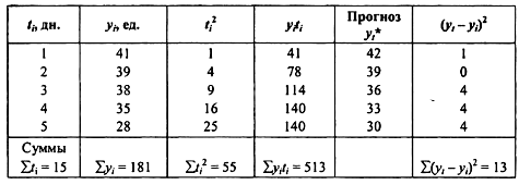 Проиллюстрируем возможные варианты прогнозов для одной реализации и для ансамбля из трех реализаций. Допустим, что нам известны значения расхода деталей со склада за пять дней работы (табл.2.2). Выберем уравнение тренда