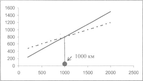 Рис. 38. Зависимость между расстоянием и издержками перевозки при выборе вида транспорта (сплошная линия — автомобильный транспорт, пунктир — железнодорожный транспорт) отложена дальность транспортировки (в км), по оси OY приведенные затраты в расчете на 1 т транспортируемого груза. Сплошной линией показана зависимость затрат на транспортировку автомобильным транспортом от дальности перевозки, пунктиром — по железной дороге. Абсцисса точки пересечения указывает равновыгодную дальность. 2. Выбор вида отправки на основе анализа полной стоимости. В середине прошлого века отечественная практика формирования оперативных транспортных связей использовала в качестве критерия оптимальности минимум провозных плат. Однако уже в начале 60-х гг. была установлена ограниченность критерия "цена перевозки", который не включает в себя прочие расходы, называемые также вторичными, или альтернативными, издержками[35]. В настоящее время общепризнанным критерием выбора вида транспорта являются полные издержки предприятия, включающие не только транспортную услугу, но и прочие расходы, связанные с конкретным вариантом транспортировки. Данный критерий нашел отражение в понятии "Least Total Distribution Costs" — наименьшие суммарные издержки товародвижения. Таким образом, в качестве ведущего критерия выбора вида отправки должны приниматься общие издержки товародвижения, которые можно считать равными сумме тарифа за перевозку и вторичных или альтернативных расходов потребителя транспортных услуг. В табл. 15 представлены исходные данные, а в табл. 16 — пример расчета суммарных приведенных затрат по двум вариантам транспортировки на фиксированное расстояние (железная дорога и автотранспорт). Помимо движенческих затрат и затрат на начальные и конечные операции в расчет включены также: • затраты на содержание запасов в пути, размер которых зависит от срока доставки; • затраты на страховые запасы, размер которых в нашем примере равен сроку доставки груза. Как видим, при увеличении стоимости перевозимого груза фактор затрат на содержание запасов в пути начинает оказывать существенное влияние на решение по выбору вида транспорта. В нашем примере груз стоимостью свыше 31 тыс. руб. за 1 т транспортировать по железной дороге на данное расстояние нецелесообразно (см. строку 13 табл. 16, а также рис. 39). Таблица 15 Исходные данные для выбора варианта транспортировки