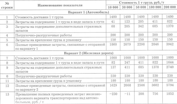 где ЗНК1; ЗНК2 — удельные затраты (тарифные ставки) на начальные и конечные операции транспортного процесса, включая расходы на подачу транспортного средства, его погрузку и выгрузку, соответственно по первому и второму видам транспорта; 3Д1, Зд2 — удельные затраты (тарифные ставки) на движенческие операции по первому и второму видам транспорта. Числитель данной формулы представляет собой разность постоянных затрат. В качестве уменьшаемого принимаются те удельные затраты, которые имеют больший размер. В знаменателе рассчитывается разность переменных затрат. Здесь уменьшаемым являются удельные движенческие затраты того вида транспорта, который в числителе является вычитаемым. Рассмотрим пример расчета равновыгодной дальности транспортировки для железнодорожного и автомобильного транспорта. Тарифные ставки на начальные и конечные операции процесса транспортировки (условно постоянные затраты) составляют[34]: • по железнодорожному транспорту Знкж = 400 руб/т; • по автомобильному транспорту 3НКА =100 руб/т; Тарифные ставки на движенческие операции (условно переменные затраты) составляют: • по железнодорожному транспорту Здж = 0,4 руб/ткм; • по автомобильному транспорту Зда = 0,7 руб/ткм; Равновыгодная дальность, т. е. расстояние, стоимость транспортировки на которое для автомобильного и железнодорожного транспорта будет одинакова: L р = (400-100)/ (0,7 - 0,4) = 1000 км. В табл. 14 представлен расчет приведенных затрат (в расчете на 1 т перевозимого груза) для ряда значений дальности транспортировки. В графе 8 рассчитано превышение суммарных приведенных затрат железнодорожного варианта транспортировки над автомобильным. Как видим, точка "равновыгодной дальности" находится на расстоянии 1000 км. Таблица 14 Расчет превышения суммарных приведенных затрат железнодорожного варианта транспортировки над автомобильным, руб. / т