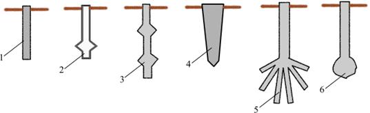 1 – цилиндрическая; 2 – с уширением; 3 – с уширением по стволу; 4 – коническая; 5 – с камуфлетным расширением; 6 – корневидная