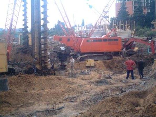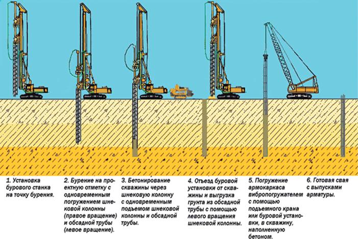 Для бутобетонных свай материал (бетон, камень) подают совмещенным или раздельным способом. Вначале укладывают бетонную смесь слоем 30-35 см, затем слой камня высотой до 25 см и производят уплотнения бетона. Подают бетонную смесь через инвентарную загрузочную воронку. При возведении железобетонных свай после подготовки скважины устанавливают арматурный каркас, затем его бетонируют. К буронабивным относят и грунтобетонные сваи. Для их устройства пробуривают лидирующие скважины с извлечением грунта, затем в скважины подают необходимый объем песка, цемента, химических добавок и разбуривают до проектного диаметра, одновременно измельчая грунт и перемешивая компоненты грунтобетонной смеси. Уплотняют смесь путем обратного вращения бура. При устройстве буронабивных свай применяют установки вращательного, ударно-канатного и грейферного бурения, а также шнековые буровые установки и находят применение оборудования зарубежных фирм «Касагранде» (Италия), «Беното» (Франция), «Като» (Япония) с использованием обсадных труб, извлекаемых из скважины в процессе бетонирования. Сваи могут бетонироваться без обсадной трубы: в открытой скважине («сухой способ») и с заполнением скважины напорной водой или глинистым раствором («мокрый способ»), а также с обсадной трубой: с извлечением и без извлечения грунта. Частотрамбованные сваи образуются в результате забивки обсадной трубы диаметром до 600 мм с металлическим башмаком, установки арматурного каркаса и укладки высокоподвижной бетонной смеси, с одновременным подъемом обсадной трубы и возвратно-поступательными ударами молота.