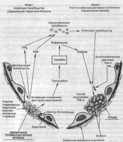 Рис, 4. Механизм образования тромба (схема). Объяснение в тексте. 3. Агрегация тромбоцитов — образование первичной тромбо-цитарной бляшки. 4. Активация процесса свертывания крови, или коагуляцион-ного каскада (схема 11), с помощью следующих механизмов: а внутренней системы свертывания, которая запускается контактной активацией фактора XII (Хагемана) коллагеном, фактора XI, прекалликреина, высокомолекулярного кининогена и усиливается фосфолипидом тромбоцитов (фактор 3), высвобождающимся при конформационных изменениях их мембраны; ▲ внешней системы свертывания, которая запускается тканевым тромбопластином, высвобождающимся из поврежденного эндотелия (тканей), и активирует фактор VII. В конечном итоге оба пути приводят к превращению протромбина (фактор II) в тромбин (фактор Па), который способствует превращению фибриногена в фибрин, а также вызывает дальнейшее выделение АДФ и Тх-А2 из тромбоцитов, способствуя их агрегации. 5. Агрегация стабилизируется образующимися отложениями фибрина — стабилизация первичной бляшки. В дальнейшем фи-бриновый сверток захватывает лейкоциты, агглютинирующиеся эритроциты и преципитирующие белки плазмы крови. Таким образом, можно выделить следующие стадии морфогенеза тромба:- агглютинация тромбоцитов; - коагу-ляция фибриногена с образованием фибрина; - агглютинация эритроцитов; - преципитация плазменных белков. Система свертывания работает в тесной связи с фибринолити-ческой системой, которая модулирует коагуляцию и препятству-ет тромбообразованию. Механизм действия фибринолитической системы складывается из следующих стадий: а превращение проэнзима плазминогена в плазмин — наиболее важный фибринолитический фермент; а растворение фибрина с помощью плазмина; а взаимодействие фибринолитической системы с системой свертывания на уровне активации фактора XII в ХПа связывает систему свертывания, систему комплемента и ки-ниновую систему. Морфология тромба. Тромб обычно прикреплен к стенке сосуда в месте ее повреждения, где начался процесс тромбообразо-вания. Он может быть пристеночным (т.е. закрывать только часть просвета) или обтурирующим. Поверхность тромба шероховатая. Пристеночные тромбы в крупных артериях могут иметь гофрированную поверхность, что отражает ритмичное выпадение склеивающихся тромбоцитов и выпадение фибрина при продолжающемся кровотоке. Тромб, как правило, плотной консистенции, сухой. В зависимости от строения и внешнего вида, что определяется особенностями и темпами тромбообразования, различают белый, красный, смешанный (слоистый) и гиалиновый тромбы. Белый тромб состоит преимущественно из тромбоцитов, фибрина и лейкоцитов, образуется медленно при быстром токе крови (чаще в артериях). Красный тромб, помимо тромбоцитов и фибрина, содержит большое число эритроцитов, образуется быстро при медленном токе крови (обычно в венах). В наиболее часто встречающемся смешанном тромбе, который имеет слоистое строение (слоистый тромб) и пестрый вид, содержатся элементы как белого, так и красного тромба. В смешанном тромбе различают головку (имеет строение белого тромба), тело (собственно смешанный тромб) и хвост (имеет строение красного тромба). Головка прикреплена к эндотелиаль-ной выстилке сосуда, что отличает тромб от посмертного сгустка крови. Слоистые тромбы чаще образуются в в