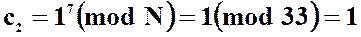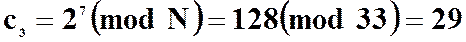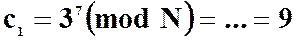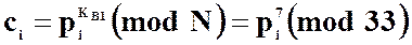 7) Зашифровывает текст, представленный в виде последовательности чисел p 1, p 2 и p 3, используя ключ КВ1 =7 и N = 33, по формуле
