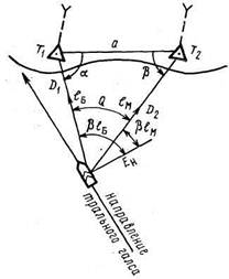Из визуальных способов определения места наиболее точным является способ прямой засечки, при котором по команде штурмана трального корабля одновременно измеряют направления на тральный корабль с двух теодолитных постов, расположенных на берегу (рис.2).