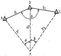 Определение места по двум горизонтальным углам (обратная засечка), одновременно измеряемым секстанами двумя наблюдателями, между направлениями на опорные пункты менее точно, чем определение способом прямой засечки, но более удобно в организационном отношении (рис.3).