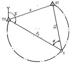 При выборе опорных пунктов для избежания неопределённости необходимо, чтобы разность 360° - (α + β +В) отличалась от 0 или 180° не менее чем на 20°, где α и β – углы, измеренные секстанами, а В -угол при среднем опорном пункте между крайними пунктами. Место трального корабля наносится на планшет с гониометрической сеткой. Способ комбинированной засечки (рис.4) заключается в одновременном измерении двух углов: на берегу–теодолитным постом между направлениями на береговой ориентир и корабль, а на корабле -секстаном между направлениями на теодолитный пост и опорный пункт. Место получается в пересечении направления с теодолитного поста и дуги окружности, вмещающей измеренный секстаном угол.