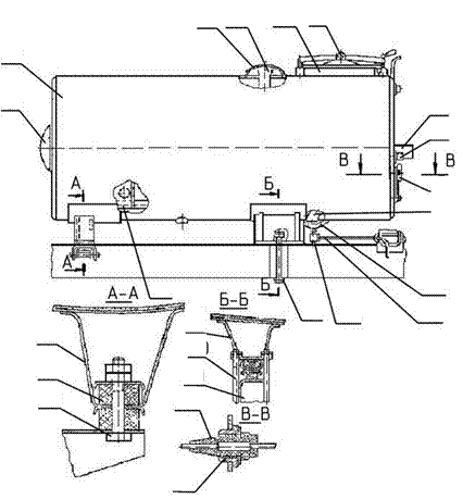 Рис. 8.2. Цистерна: 1, 4 – крышки; 2 – контрольная труба; 3 – горловина; 5 – кронштейн; 6 – труба; 7 – штуцер; 8 – заборная труба; 9 – отстойник; 10 – рычаг; 11 – кран; 12 – стремянка; 13 – волнолом; 14 – крышка горизонтального люка; 15 – обечайка; 16 – передняя опора; 17, 20 – амортизаторы; 18 – болт; 19 – задняя опора; 21 – брусок; 22 – гидроконтакт