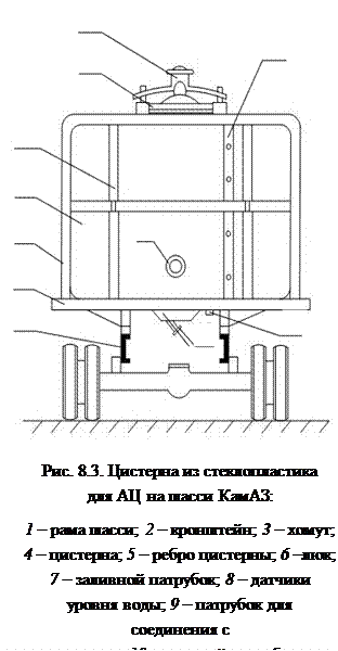 На верхней части цистерны имеется горловина 3. Она обеспечивает доступ внутрь цистерны для ее осмотра и ремонта. Горловина закрывается крышкой 4 с резиновым уплотнением. В днище имеется отстойник 9. Слив отстоя производится через кран 11, который открывается с помощью рычага 10. Забор воды осуществляется по трубе 8. На заднем днище цистерны на кронштейне 5 установлен тахометр. Штуцер 7 и труба 6 служат для подсоединения водопенных коммуникаций. В переднем днище имеется горловина горизонтального люка 14. Для уменьшения силы удара жидкости о стенки цистерны при изменении скорости движения автомобиля установлены волноломы. Для измерения уровня заполнения цистерны водой установлены гидроконтакты 22. Цистерна закрепляется в трех точках. В передней части опора 16 шарнирная, к ней болтами 18 закреплены амортизаторы 17. В задней части двумя опорами 19 через амортизаторы 20 на брусках 21 цистерна устанавливается на раму и крепится стремянками 12.