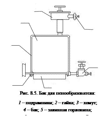 Рис. 8.4. Бак пенообразователя: Рис. 8.4. Бак пенообразователя: 1 – днище; 2 – обечайка; 3 – горловина; 4 – крышка; 5 – волнолом; 6 – отстойник; 7 – заглушка; 8 – штуцер На современных АЦ пенобаки могут иметь разную конструкцию. На рис. 8.4 представлен пенобак цилиндрической формы с окружностью в поперечном сечении. Бак состоит из обечайки 2 с двумя днищами 1. Бак заполняют пенообразователем через горловину 3, закрываемую крышкой 4. Отстой из отстойника 6 сливают через отверстие, закрываемое пробкой 7. Внутри бака имеются волноломы 5. Пенообразователь поступает в насос по трубопроводу, подсоединенному к штуцеру 8. На АЦ нового поколения баки в поперечном сечении имеют форму квадрата с закругленными углами (рис. 8.5). На верхней части бака 4 установлена заливная горловина 5 с присоединенной к ней рукавной головкой 6. Внизу закреплен вентиль 7 для поступления пенообразователя к насосу. Бак крепится хомутами 3 гайкой 2 к подрамнику. Пенобаки размещают, как правило, в насосном отсеке.