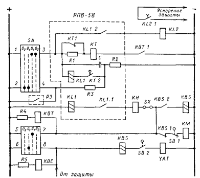 SA – переключатель на 4 состояния и 4 направления (ключ управления масляником, КУМ), РПВ-58 комплект АПВ, KL1 – двухобмоточное реле, КТ – реле времени, КМ – контактор включения, С=20 мКФ, R2=1,1 МОм, R3=510 Ом, YAT – электромагнит отключения, KBS – реле блокировки от многократных включений, KQT – реле положения «Отключено», SQ – вспомогательные контакты выключателя, KH – указательное реле срабатывания АПВ, время заряда tз=3R2C2=3*1,1*106*20*10-6=60 c, РЗ – защита, блокирующая действие АПВ.