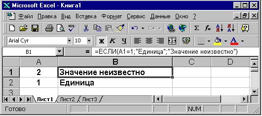 1. Терміни, які зустрічаються 2. Табличні бази даних (Списки) 3. Фільтрація списку 5. Формули проміжних обчислень в списках 6. Застосування діалогового вікна Специальная вставка 7. Кращий метод одночасного введення формул у виділений діапазон комірок 8. Об'єкти Visual Basic for Application (VBA) 1. Терміни, які зустрічаються Формула: "возвращает" В наступному тексті книги досить часто зустрічається термін - формула ВОЗВРАЩАЕТ значення. Для розуміння цього терміну розглянете наступний приклад. На рис. 1. наведений приклад – в комірки стовпця А вводиться будь-яке числове значення, а формула в стовпці В (показана в рядку формул на рис. 1.), основана на функції ЕСЛИ повертає наступний результат: • при введеному в стовпець А значенні рівному одиниці, на екрані монітора - результат обчислення - текст: Единица; • при введенні будь-якого іншого значення, результат обчислення формули: Значение неизвестно. Термін "возвратит" - це результат, отриманий при обчисленні формули, при заданих яких-небудь специфічних, введених для неї умов, які беруть участь в процесі обчислення.