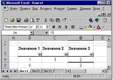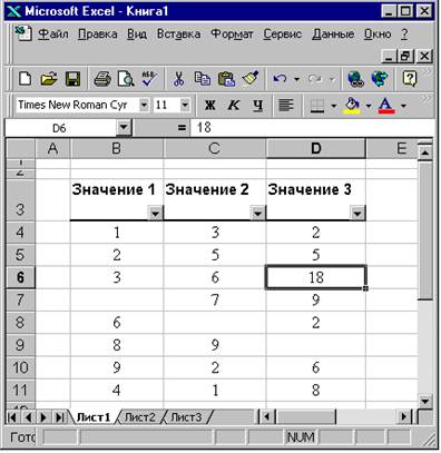 Рис. 3.2. Таблиця з числовими значеннями, яку також можна віднести до простої табличної бази даних 3. Фільтрація списку Вибрати необхідні дані із списку можна за допомогою фільтрації, тобто шляхом ховання всіх рядків списку, окрім тих які задовольняють заданим критеріям. Щоб скористатися функцією фільтрації встановіть табличний курсор в будь-яке місце списку і виконаєте команду Данные/Фильтр/Автофильтр, після чого в правому нижньому кутку кожної комірки заголовка з'явиться квадратик із стрілкою списку, що розкривається. Якщо список створений правильно, то, наприклад, при виконанні фільтрації списку в стовпці D за значенням 2, список матиме вигляд, показаний на рис. 3. Номери рядків 4 і 8, вибраних при фільтрації, будуть синього кольору.