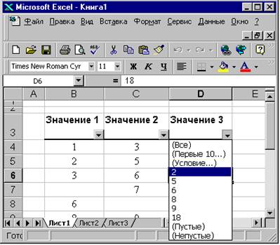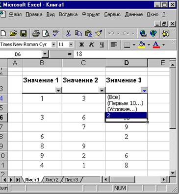 Рис. 3. Вигляд таблиці при виконанні фільтрації за значенням 2 в стовпці D В списку вибрано два рядки, що задовольняють критерію фільтрації. Причому при виконанні операції фільтрації при натисненню на кнопку автофільтру список, що розкрився, виглядає, як показано на рис. 4.