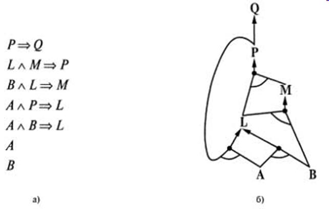 Пример применения алгоритма прямого логического вывода: простая база знаний, состоящая из хорновских выражений (а); соответствующий граф AND-OR (б) Дуги, соединенные кривой линией, обозначают конъюнкцию (в них необходимо доказать истинность каждой дуги), а дуги, не соединенные друг с другом, обозначают дизъюнкцию.