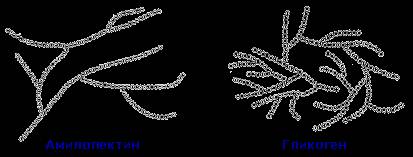 К важнейшим полисахаридам относится также гликоген (C6H10O5)n, образующийся в организмах человека и животных в результате биохимических превращений из растительных углеводов. Как и крахмал, гликоген состоит из остатков α-глюкозы и выполняет подобные функции (поэтому часто называется животным крахмалом). Макромолекулы которого отличаются большей разветвлённостью: