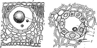 Рис. 45. Выделительные ткани: а— лизигенное вместилище эфирных масел в листе лимона; б — схизогенное вместилище (смоляной ход) в древесине сосны; 1 —клетки эпителия; 2 —капли эфирного масла; 3 — полость смоляного хода; 4 — капля смолы; 5 — склеренхима. Из них наиболее распространены железистые волоски и желёзки, приспособленные к выделению эфирных масел, смолистых веществ, нектара и воды. Желёзки, выделяющие нектар, называются нектарниками. Они имеют разнообразную форму и строение и в основном находятся в цветках, но иногда образуются и на других органах растений. Желёзки, выделяющие воду, играют роль гидатод. Процесс выделения воды в капельно-жидком состоянии называется гуттацией. Гуттация происходит в условиях повышенной влажности воздуха, препятствующей транспирации.