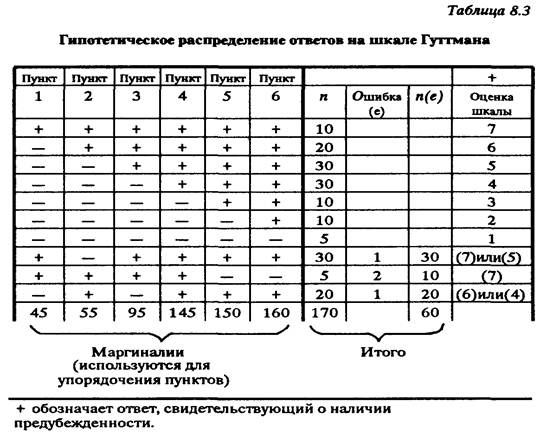 Основное допущение заключается в том, что число плюсов должно уменьшаться по мере возрастания трудности следования определенному типу поведения / отношения (или по мере возрастания его экстремальности). В данном примере результаты такого упорядочения совпадают с нашими ожиданиями в том смысле, что наблюдаемое упорядочение соответствует нашему изначальному упорядочению. Однако так бывает далеко не всегда. Каждая строка таблицы представляет группу респондентов, давших на предложенные шесть пунктов вполне определенный набор ответов. Так, первая строка сверху представляет тех 10 респондентов (n =10), чьи ответы на все шесть вопросов свидетельствуют о наличии у них сильной предубежденности против студентов. Вторая строка сверху представляет тех 20 респондентов, чьи ответы указывают на наличие предубежденности по всем пунктам, кроме пункта 1, и т. д. Первые семь строк таблицы представляют те наборы ответов, которые полностью соответствуют допущению о [c.259] том, что данные шесть пунктов связаны между собой отношением порядка. Группы респондентов, для которых характерен любой из этих семи наборов ответов, называются типами идеальной шкалы (perfect scale types). При шкалировании по Гуттману количество типов идеальной шкалы всегда на единицу больше числа пунктов данной шкалы, поскольку полное отсутствие измеряемого свойства (отсутствие предубежденности, как в строке 7) рассматривается как идеальная оценка (perfect score). Каждой идеальной оценке приписывается число от 1 до i +1, где i – количество пунктов (items) шкалы, причем 1 обозначает тех респондентов, которые в наименьшей степени обладают измеряемым свойством, а i +1 – тех из них, кто обладает им в наибольшей степени. Таким образом, каждому респонденту приписывается соответствующая оценка. Так, в нашем примере каждый из 10 респондентов строки 1 (чьи ответы отражают самую высокую степень предубежденности) получает оценку 7 (i +1 = 6+1 =7), каждый респондент из строки 2 – оценку 6 и т. д. до оценки 1, выставляемой каждому респонденту из строки 7. Эти оценки ранжируют (упорядочивают) всех респондентов соответственно степени их предубежденности против студентов. Нам осталось объяснить строки 8, 9 и 10. Один или более ответов из этих строк не укладываются в предсказанный нами заранее порядок пунктов. На самом деле это ответы тех, кто, взбираясь по лестнице, перескочил через одну или более ступенек. О подобных наборах ответов принято говорить, что они содержат одну или более ошибок (errors). Термин “ошибка” обозначает здесь не оплошность респондента, а несоответствие данных случаев основному допущению шкалирования по Гуттману. Встречая подобные ошибки – а они вполне обычны, – мы вынуждены обратиться к следующей процедуре. Прежде всего следует подсчитать, какое число изменений в строке минимально необходимо для того, чтобы получить идеальную оценку. К примеру, в строке 8 плюс в столбце 1 можно изменить на минус, в результате получим оценку 5; или, наоборот, изменив минус в столбце 2 на плюс, получим оценку 7. И в том, и в другом случаях мы внесли изменение [c.260] только в один пункт, поэтому мы можем сказать, что строка 8 содержит одну ошибку. Это обстоятельство отмечено в столбце под названием “Ошибка” – “Error” (e). Затем мы умножаем число ошибок (т.e. 1) на число случаев, в которых встретились данные ошибки (т.e. 30), и результат зано